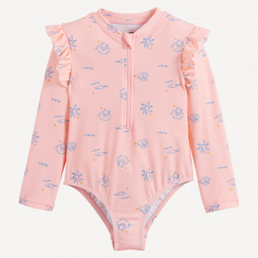 Λεπτομέρειες προϊόντος - 1 τεμάχιο - Στρογγυλή λαιμόκοψη με φερμουάρ στο κάτω μέρος - Μακριά μανίκια - Βολάν στους ώμους - Τύπωμα με κοχύλια - Προστασία από την υπεριώδη ακτινοβολία UV UPF 40+, σύμφωνα με το πρότυπο EN13758-1 - Τα αποτελέσματα των εργαστηριακών δοκιμών για αυτό το ύφασμα είναι UPF 50+Σύνθεση και Φροντίδα - Κύριο ύφασμα: 80% πολυαμίδη, 20% ελαστάνη - Δευτερεύον ύφασμα: 100% πολυαμίδη - Πλύσιμο στους 30°C σε απαλό κύκλο - Δεν σιδερώνεται / Μη χρησιμοποιείτε λευκαντικό - Απαγορεύεται το στεγνωτήριο - Δεν επιτρέπεται το στεγνό καθάρισμα